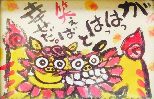 この言葉とオレンジ&黄色という元気色シーサーが描かれたポストカード。見ているだけで元気が出て、笑顔になれるのでお気に入りです。